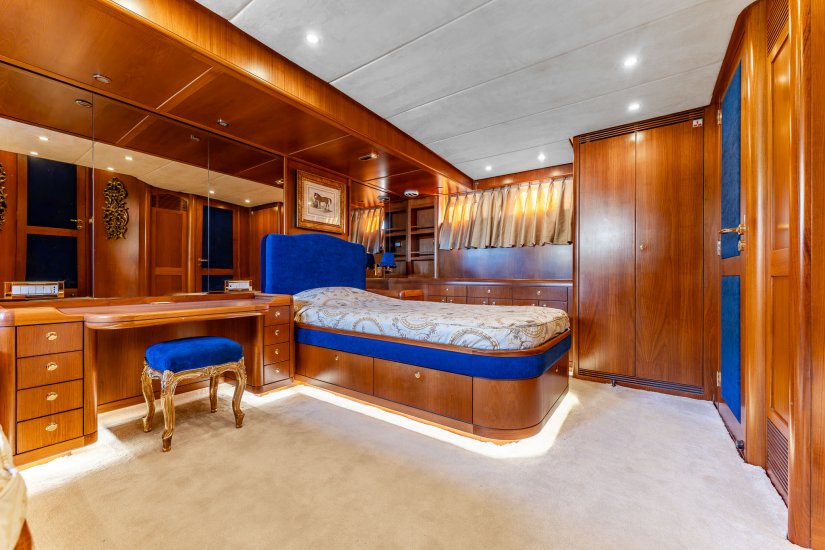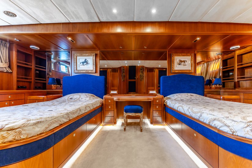 Oorspronkelijk werd het jacht ontworpen met drie hutten en een bemanningshut in het voorschip (voor vier personen), maar de eerste eigenaar koos ervoor om de twee voorste hutten samen te voegen tot één royale, volle-breedte hut met ensuite badkamer.