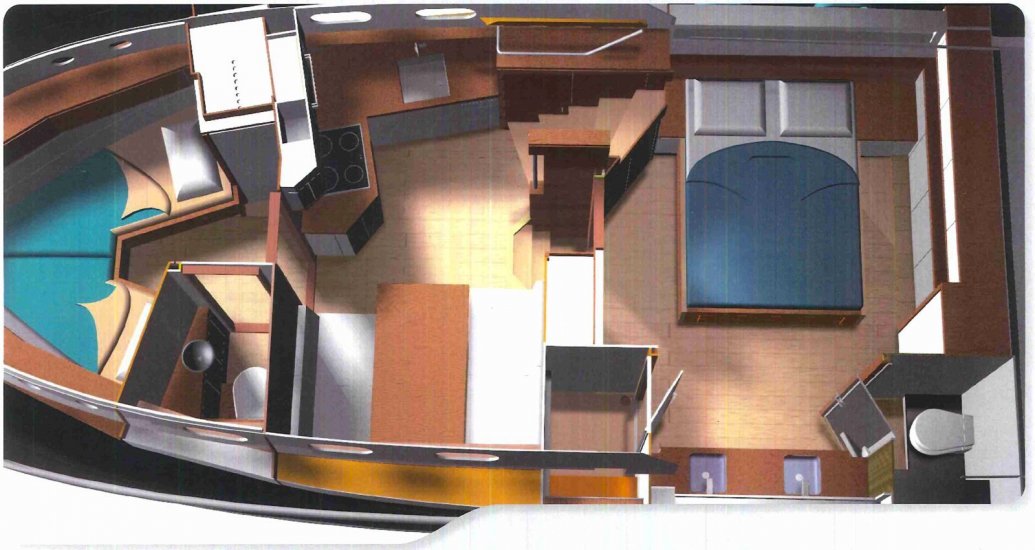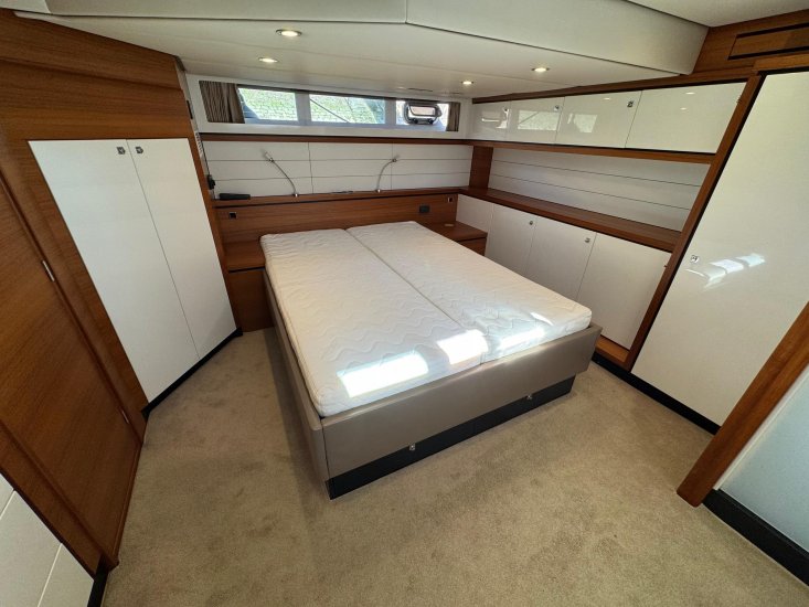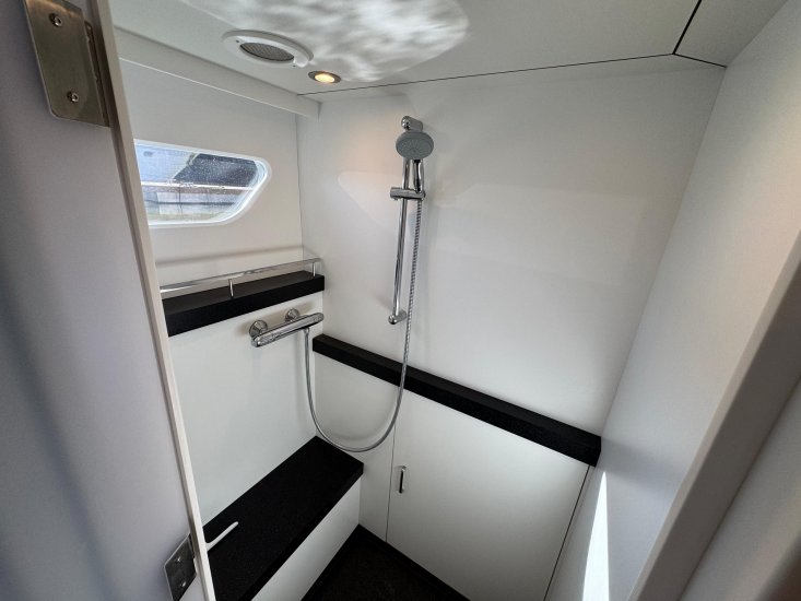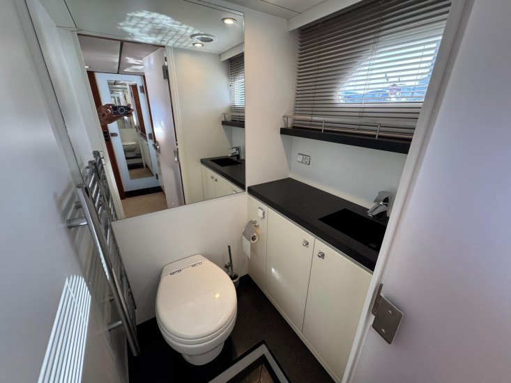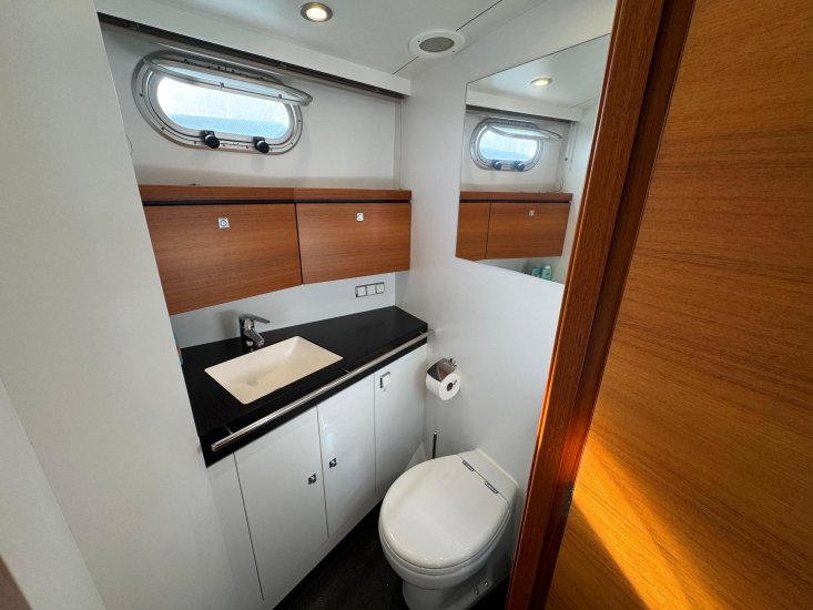 Im hinteren Teil des Bootes befindet sich die geräumige Eignerkabine mit einem großen freistehenden Bett (über 2 m), das quer angeordnet ist. Daneben befindet sich eine separate, geräumige Dusche und Toilette.