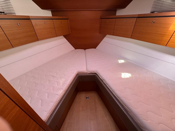 Im Vorschiff befindet sich eine komfortable Gästekabine mit zwei Betten in V-Form, reichlich Schrankraum und einer Fluchtluke. Ausgestattet mit einer Klimaanlage und zu öffnenden Bullaugen für eine natürliche Belüftung.