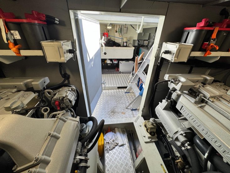 Teakholz-Türen führen auf das Achterdeck mit einer bequemen Rundsitzgruppe. Auf dem Achterdeck befindet sich auch die Luke zum Maschinenraum, der neben der Technik auch reichlich Platz für z.B. Fahrräder oder zusätzlichen Stauraum bietet.