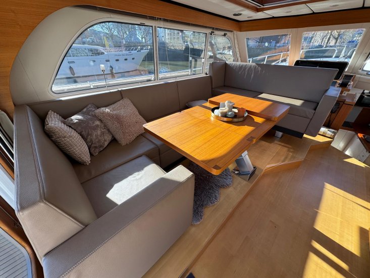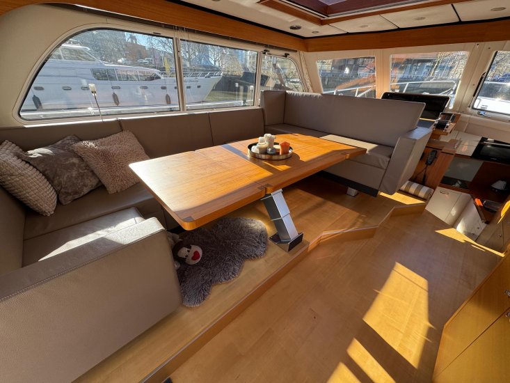 Über die Treppe erreichen Sie das Steuerhaus mit Innensteuerstand und Sofa für mehrere Personen. Die geräumige Sitzecke mit großem Tisch bietet dank der großen Fenster rundherum eine schöne Aussicht. Das große Schiebedach sorgt für zusätzliches Licht und Belüftung.