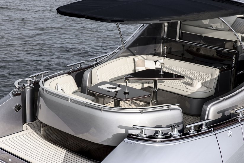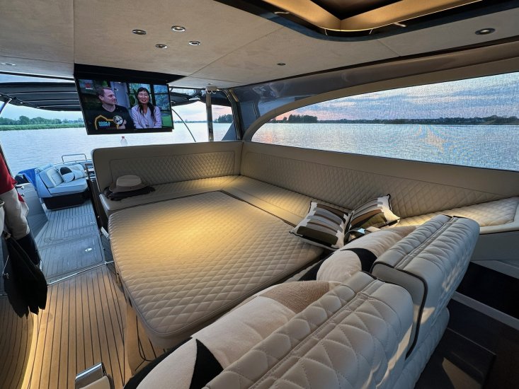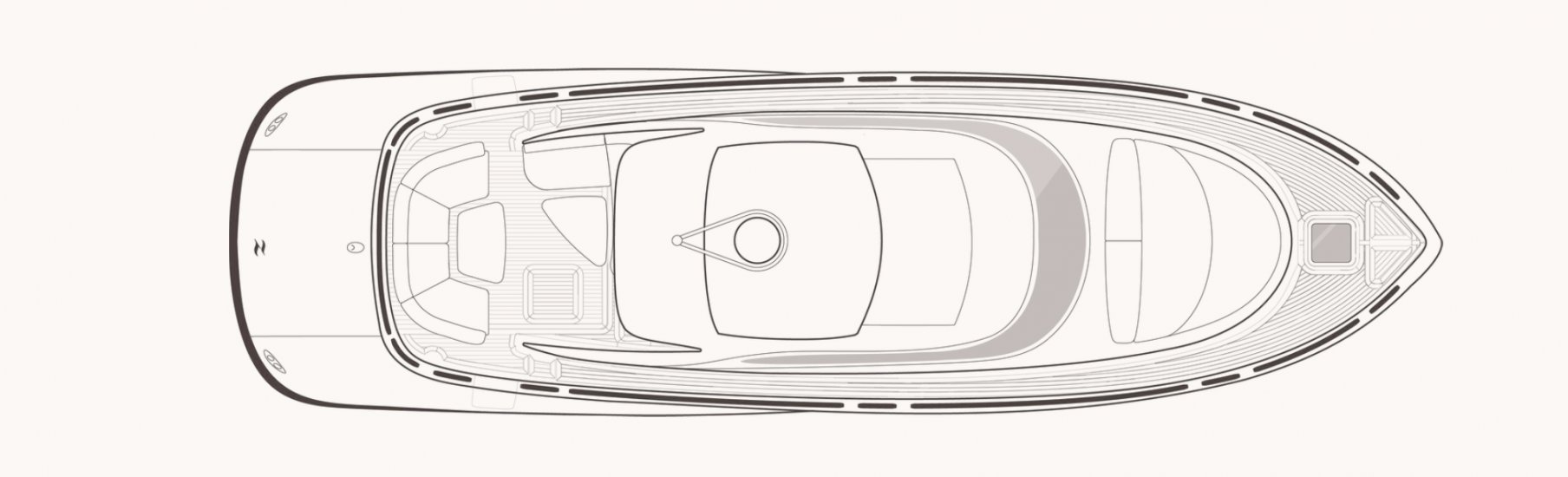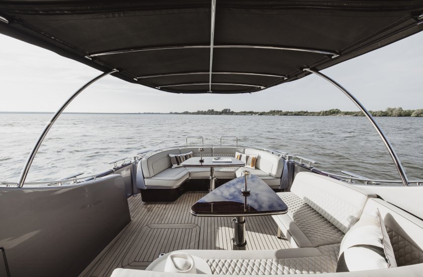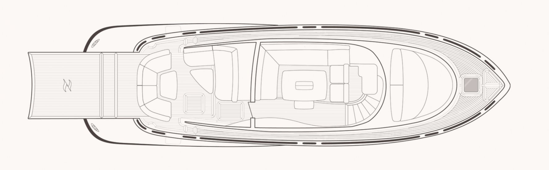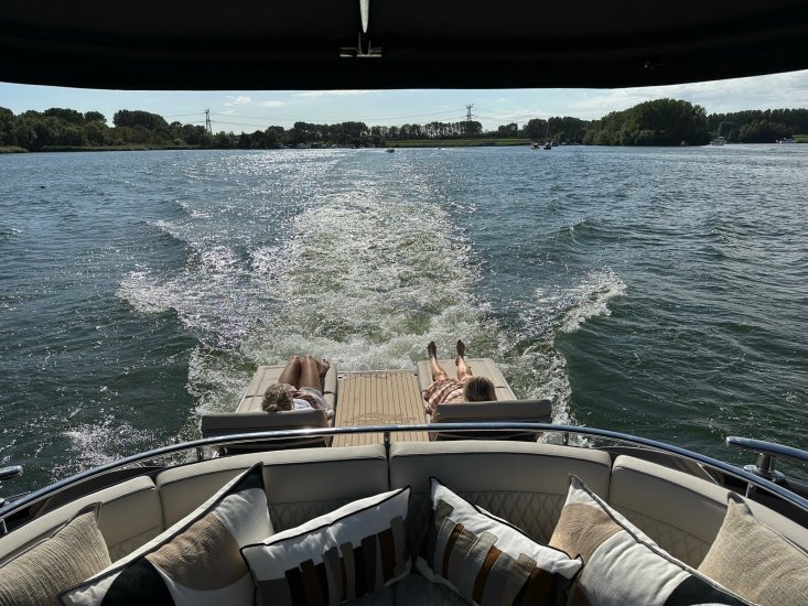 Die große Badeplattform verfügt über zwei integrierte Liegestühle mit Kissen, eine Außendusche und einen elektrischen Steg, der sowohl als Gang zum Kai als auch als Badeleiter genutzt werden kann. Auf dem Vordeck befindet sich ein großzügiges Sonnendeck.
