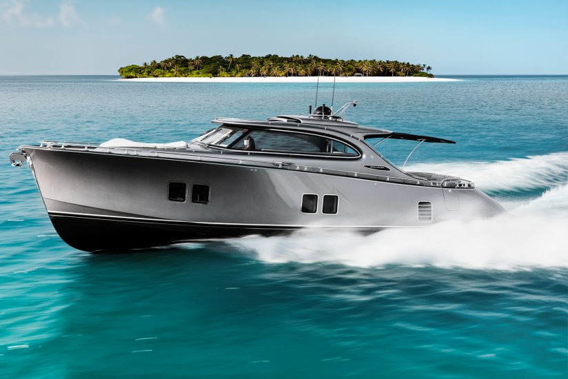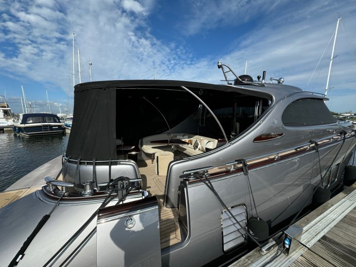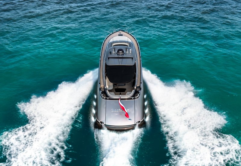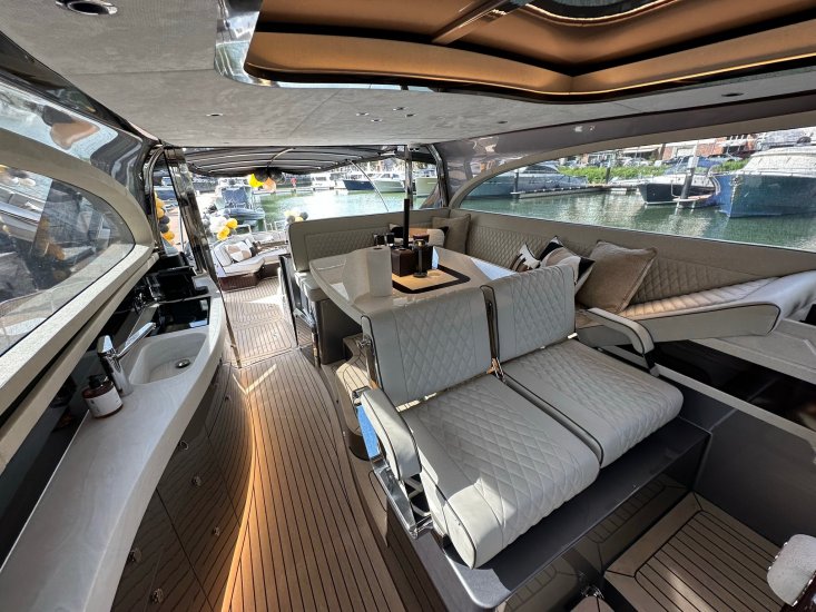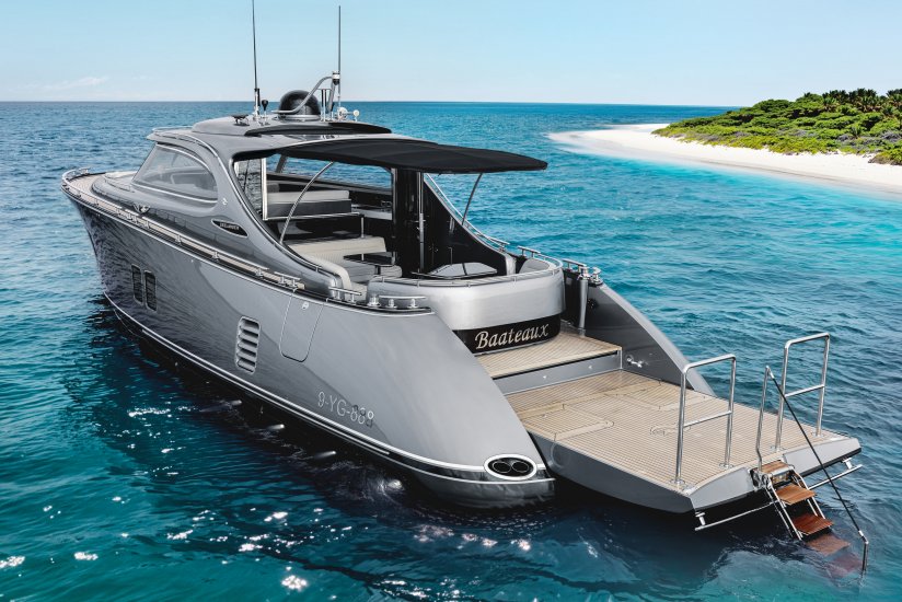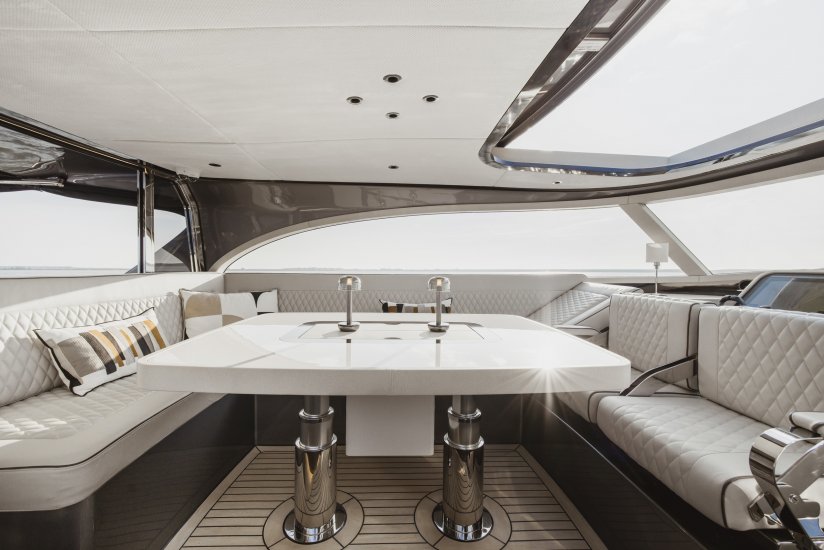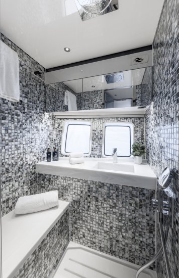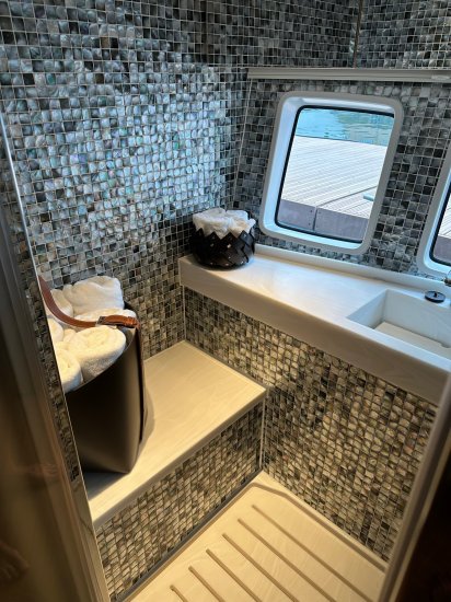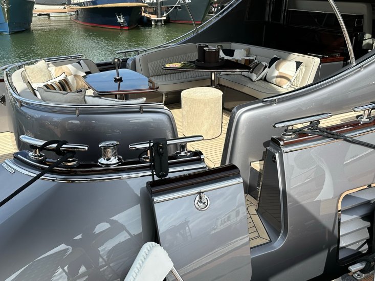 Die große Badeplattform verfügt über zwei integrierte Liegestühle mit Kissen, eine Außendusche und einen elektrischen Steg, der sowohl als Gang zum Kai als auch als Badeleiter genutzt werden kann. Auf dem Vordeck befindet sich ein großzügiges Sonnendeck.