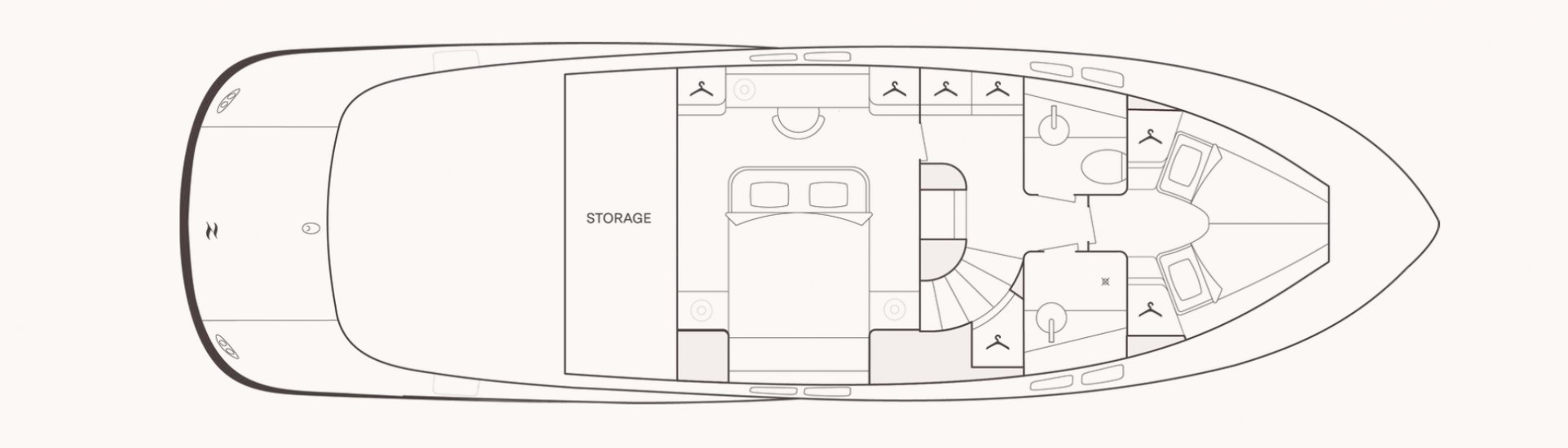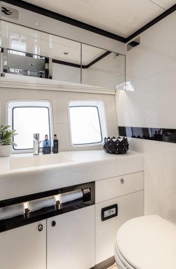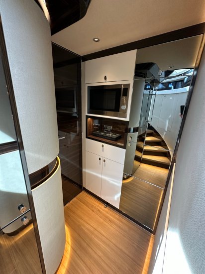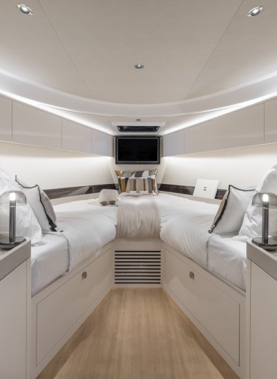 Im Untergeschoss befinden sich zwei luxuriöse Schlafzimmer, beide mit Fernseher, ein separates Badezimmer mit Toilette und ein zweites Badezimmer mit Dusche. In der zentralen Halle befinden sich das zentrale Bedienfeld, ein großer Kühlschrank, eine Kaffeeecke und zusätzliche Schränke. Selbstverständlich sind alle Räume mit Klimaanlage, Lüftung und Heizung ausgestattet.