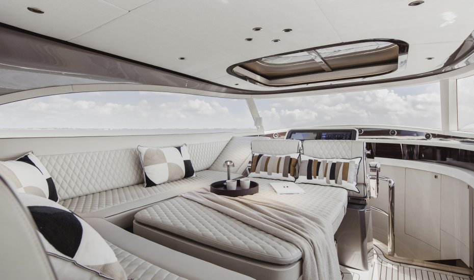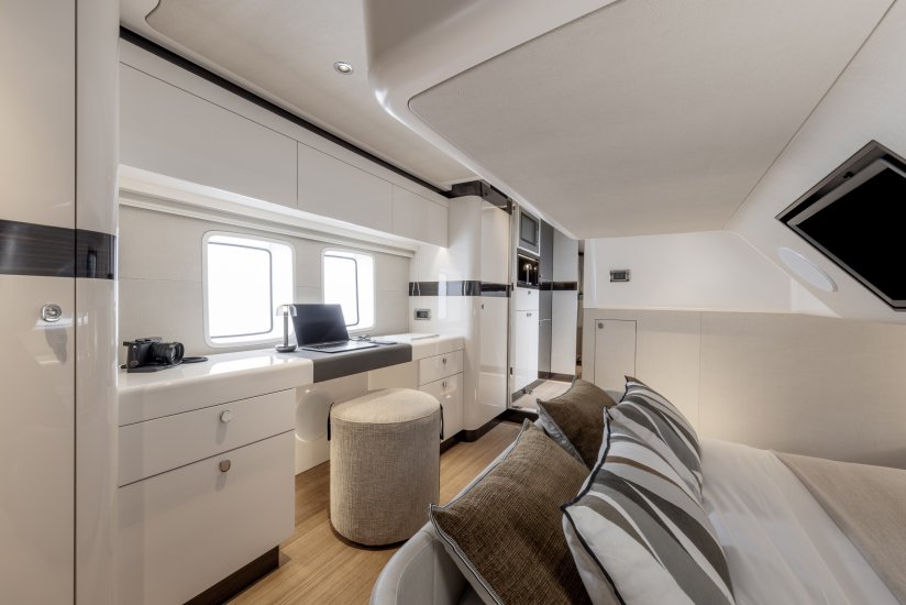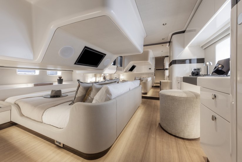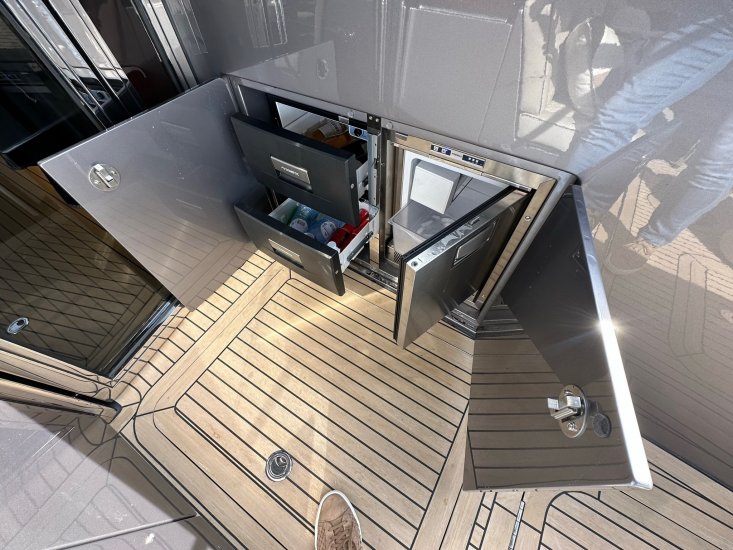 Der Salon bietet eine 360-Grad-Sicht, Sitzgelegenheiten für sechs Personen und ist mit einer Fußbodenheizung und einer kompletten Küchenzeile mit Geschirrspüler und Schubladen mit Seefeststellsystem für Geschirr ausgestattet. Über dem Steuerstand befindet sich ein großes Schiebedach, und die Achtertür hat eine große Tür und ein Schiebefenster, so dass das Achterdeck problemlos in den Salon einbezogen werden kann. Wenn beide geschlossen sind, liegt der Geräuschpegel beim Segeln unter 60 Dezibel. Der Salontisch ist elektrisch höhenverstellbar und kann in eine große Liege verwandelt werden, auf der man über den elektrischen TV-Bildschirm an der Decke fernsehen kann.