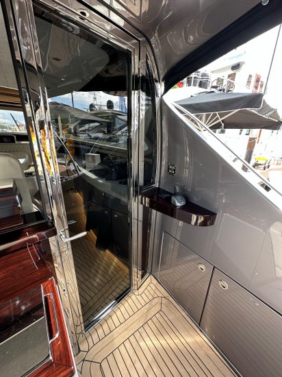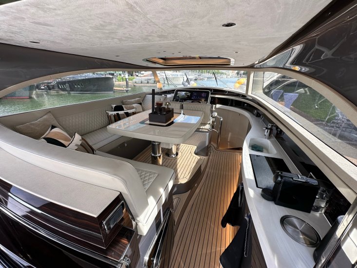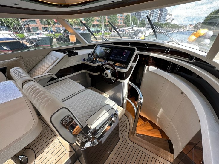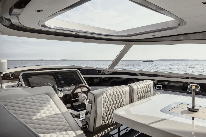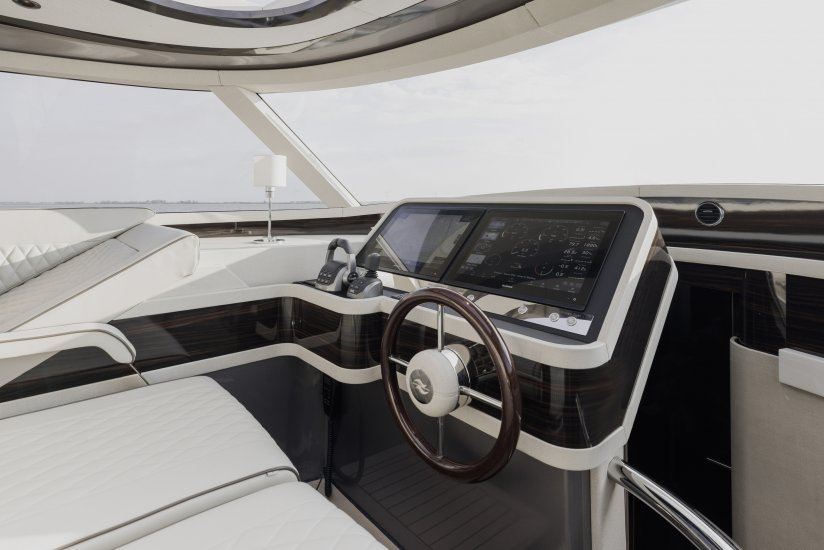 Der Steuerstand verfügt über zwei große Garmin-Displays mit allen modernen Navigations- und Informationssystemen. Dank des IPS-Systems ist das Andocken besonders einfach. Das Dynamic Positioning System (DPS) hält die Yacht automatisch in Position - ideal an Brücken und Schleusen.